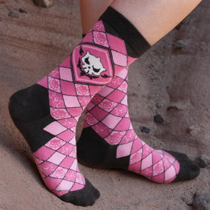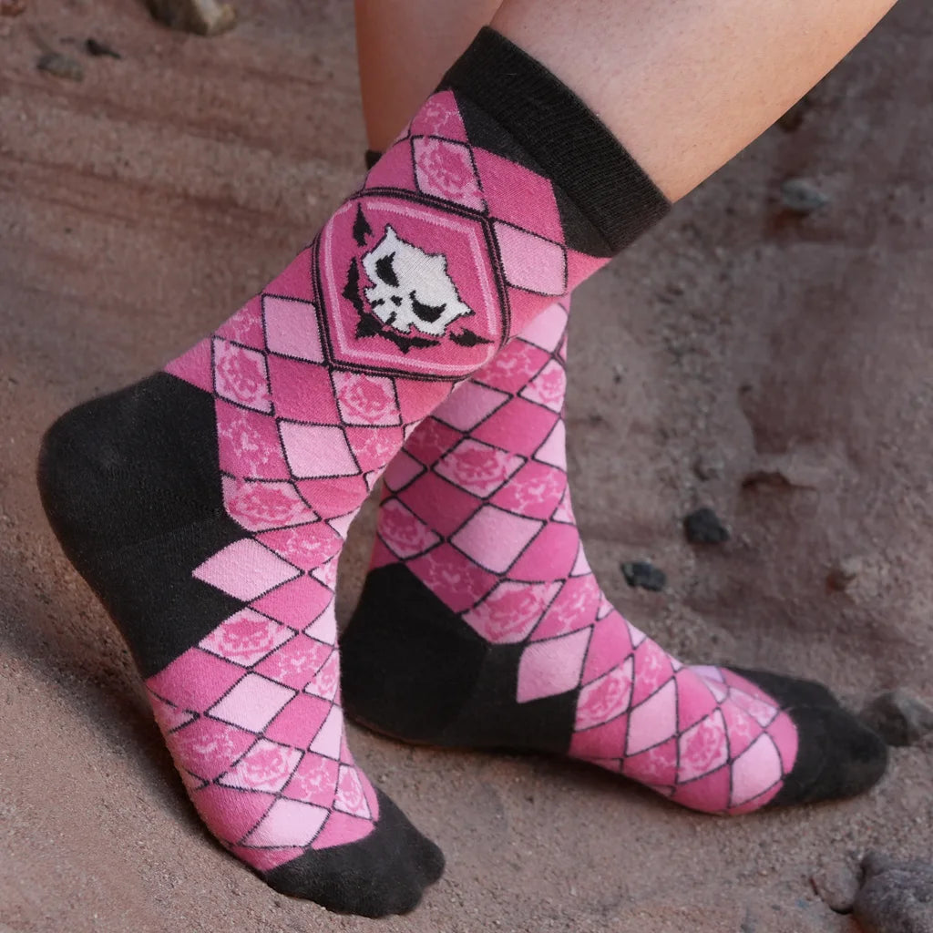 The power of love and peace will keep you comfy while you rock these Guilty Gear Strive socks, inspired by Elphelt! This limited edition footwear features the logo for Speothos Venaticus and an all over print that is cute enough to catch your heart, and metal enough to look tough in the mosh pit. A perfect pairing for our limited edition tee, grab these Elphelt socks and show your commitment to love and chaos!