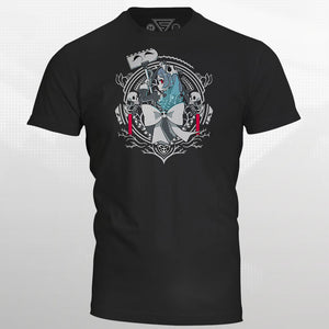 The shirt design for Marie is wonderful, the big bow with the skullheart flame and the skeletons holding her border is a nice touch. And the border of the art itself is so nicely detailed. I'm impressed with not only the shirt design but the quality of the shirt itself, it feels nice and soft, something nice to wear when relaxing or going out in public or well, whatever! Thank you Eighty Sixed for this amazing shirt!