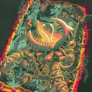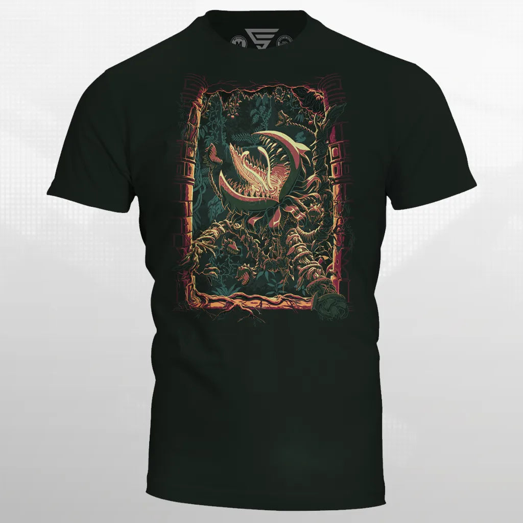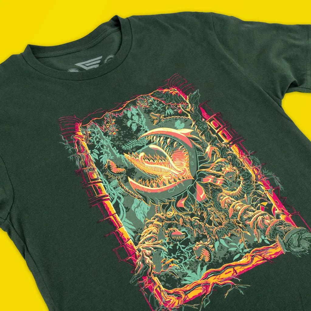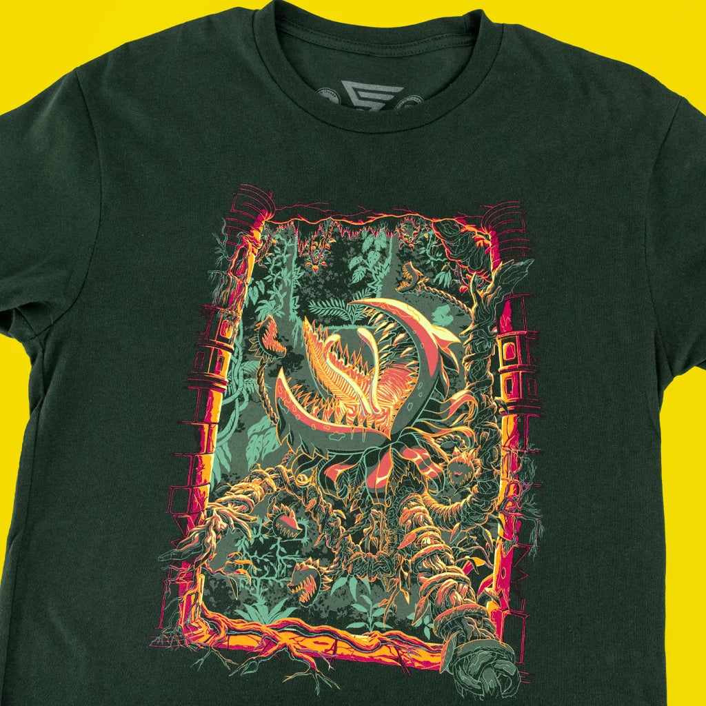 Prepare for combat in the Terrarian tropics with an officially licensed Terraria T-Shirt featuring Plantera! As you explore the Underground Jungle, a flower bulb with a pink glow heralds the presence of a monstrous bit of flora. Watch out for her long vines and creeping attack, captured with deadly detail in this brand new limited edition drop. Loot yours before this shirt is lost to the clutches of the Underground Jungle!