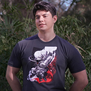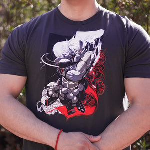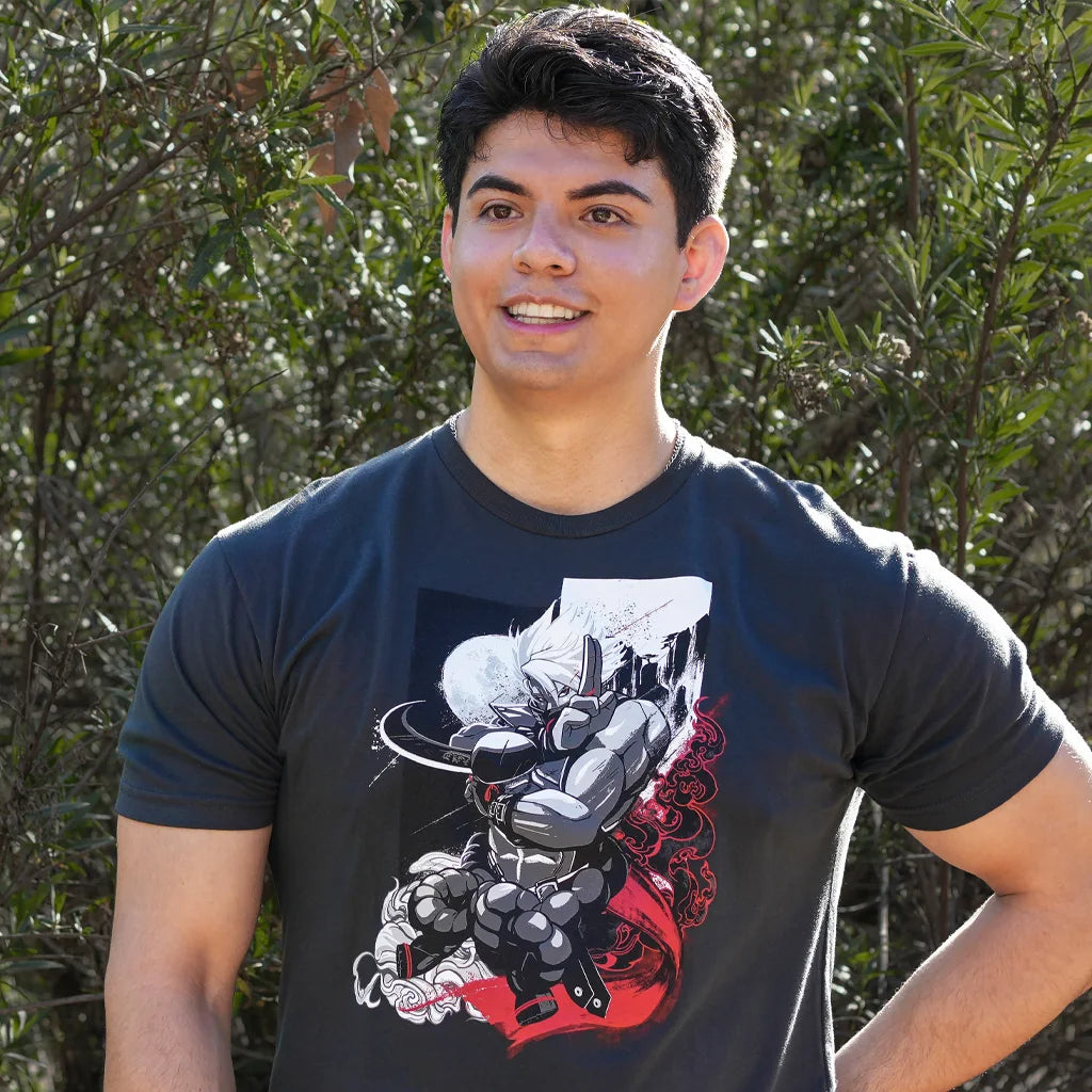 From the shadows, the Godspeed Ninja appears! A moonlit Chipp Zanuff brings an overwhelming supersonic assault to our Guilty Gear Strive collection. Grab this shirt and seize your chance to fight like a tiger, fly like an eagle, and play the hero! Beware - this shirt could disappear back into the darkness once sold out.